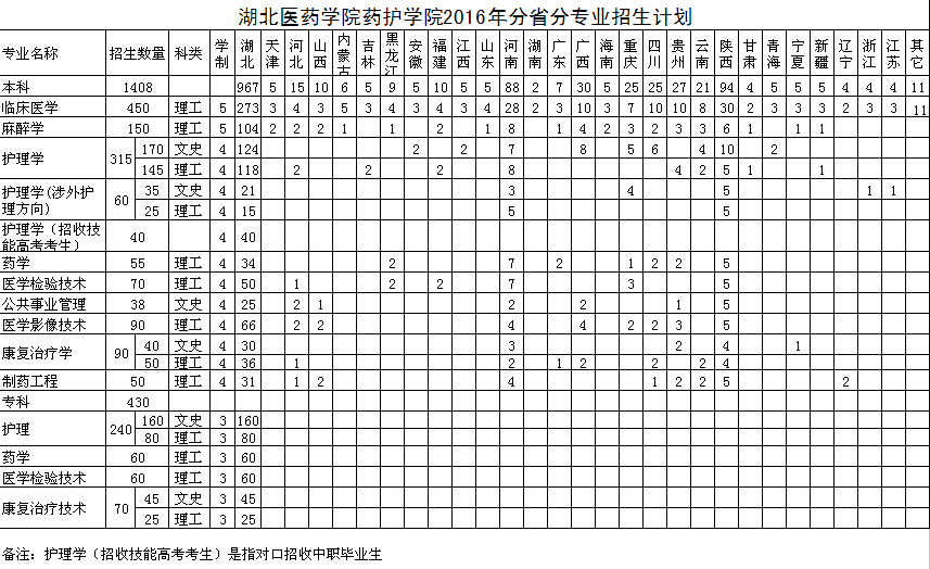湖北医药学院药护学院2016年分省分专业计划
