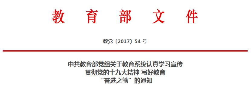 认真学习、深入领会、大力宣传、全面贯彻党的十九大精神,是当前和今后一个时期教育系统的首要政治任务。各级教育部门和各级各类学校要紧密团结在以习近平同志为核心的党中央周围,不忘初心、牢记使命,把广大党员干部和师生员工的思想和行动统一到党的十九大精神上来,把智慧和力量凝聚到落实党的十九大确定的各项任务上来,从教育实际出发,着眼于解决人民群众关心的实际问题,着眼于推进教育现代化,着眼于当前的重点工作,努力谋划好、奋力实施好“奋进之笔、得意之作”,走出一条有教育特色的学习宣传贯彻党的十九大精神之路。现将有关要求通知如下。