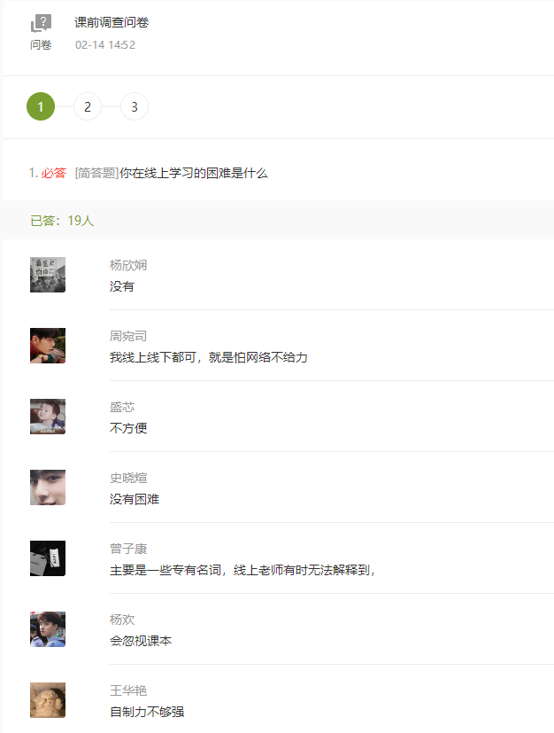 线上教学对师生都属新鲜事物,教学效果也未可知。因此,教学开展一周后,教研室组织了问卷调查,就这些教学方式进行效果分析。经调查,学生比较认可直播和超星平台组织课堂互动的方式,表明学生潜意识还是认可有规律和有纪律的学习,正如有同学说“这种方式能够很好的督促自己按时按课表学习,不至于放飞自我”。根据收集的意见和反馈,教研室及时对教学方式进行了微调,目前各项工作有序进行。