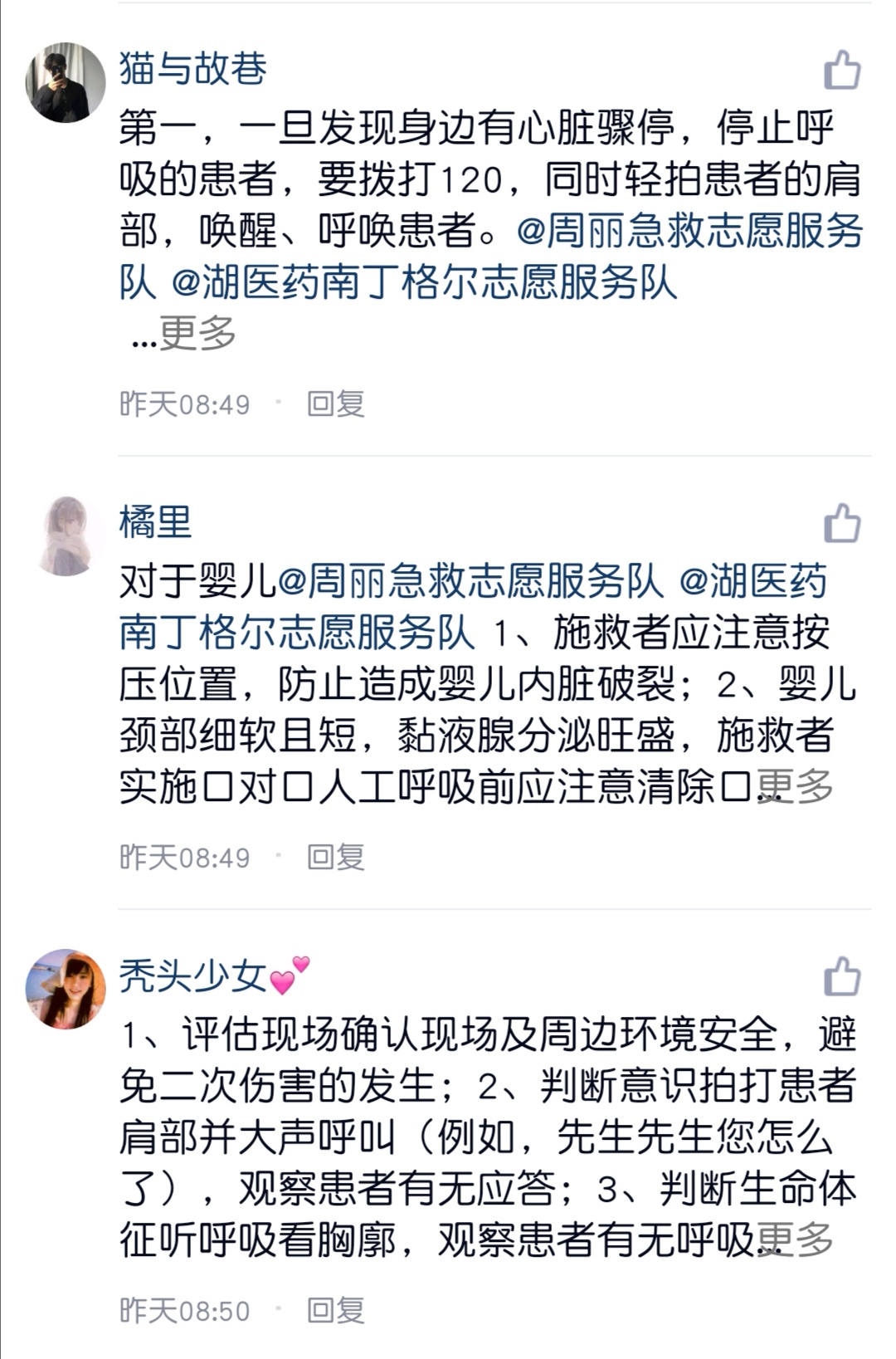 在这次活动中,同学们通过网络积极参与了本次活动。大家专业而细心地列出了心肺复苏的流程,更有同学考虑到了成人心肺复苏和儿童心肺复苏的区别,对心肺复苏的适用情况进行了积极的讨论。这不禁让人想起周丽急救志愿服务队的创始人--周丽,那个在宁波街头用心肺复苏术救了被撞得昏迷不醒的老人,而后却不留姓名悄然离去的姑娘。在那样紧急的情况下,她能够勇敢地站出来,能够冷静沉稳地做出判断,抓住了“黄金五分钟”,为后来的抢救赢得了宝贵的时间。沉着冷静是医学生必须拥有品质也是必须做到的职业使命。从医学知识的学习与应用,到职业使命的传授和熏陶,再到临床的实践操作,医学生们“十年磨一剑”。