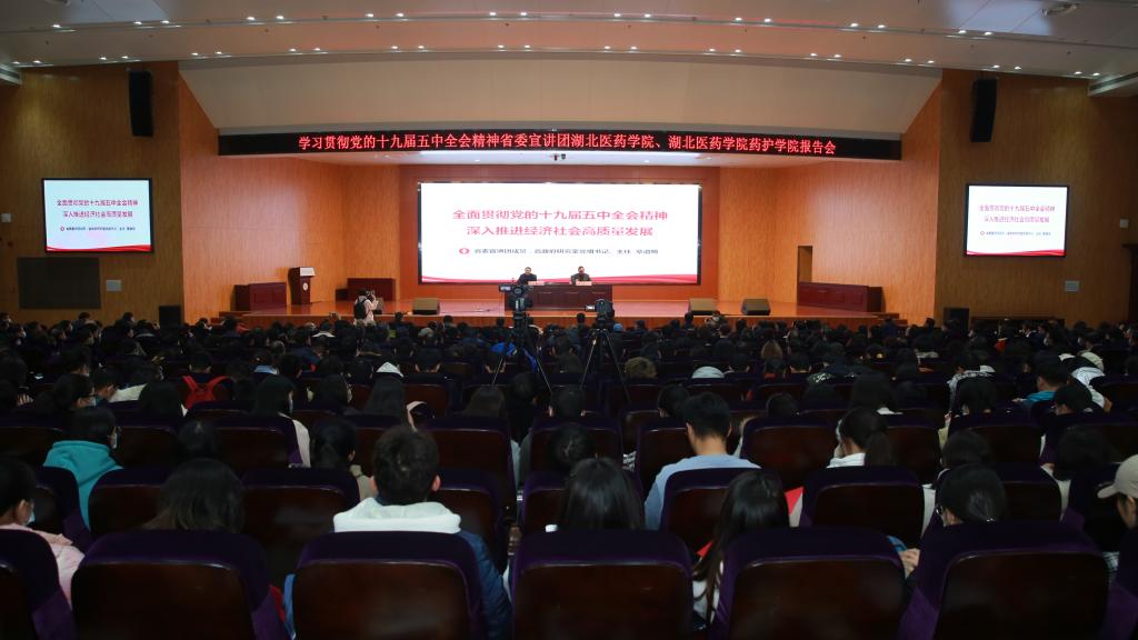 本网讯(文/鲍晓宇 图/郑建超)11月26日下午3点,学习贯彻党的十九届五中全会精神省委宣讲团湖北医药学院、湖北医药学院药护学院报告会在科教楼学术报告厅举行,湖北省委讲师团成员、湖北省政府研究室主任覃道明同志以“全面贯彻党的十九届五中全会精神、深入推进经济社会高质量发展”为题作报告。校院两级党委中心组成员、全体处级以上干部、全体党员;党支部书记;秋季党校学员(预备党员、发展对象培训班学员)、无课师生参会。会议由校党委书记涂汉军主持。