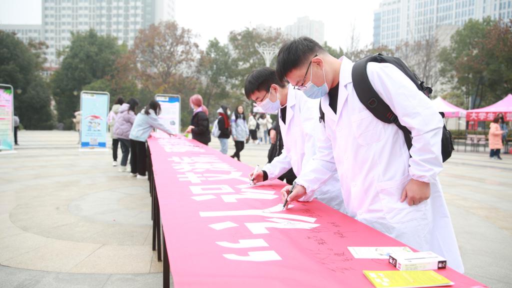 本网讯(图/鲍晓宇 文/学通社记者 喻千千 安瑶)11月30日下午2:30,在第33个世界艾滋病日来临之际,一场以“携手防疫抗艾,共担健康责任”为主题的防艾宣传活动在湖北医药学院文明广场举行,活动由十堰市政府防艾办、十堰市卫生健康委、十堰市计生协联合湖北医药学院、湖北医药学院药护学院共同主办。