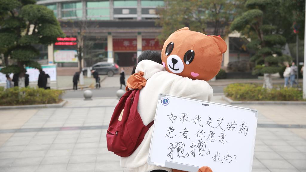 “爱的抱抱”活动吸引了广大学生参与其中,活动现场两只人扮玩偶熊,怀中拿着标识:“如果我是艾滋病人,你会抱抱我吗?”湖医药大学生主动上前,拥抱“小熊”,给予他们温暖。“我知道拥抱是不会传染的,所以我想在自己力所能及的范围内给他们一点鼓励和温暖。”参与拥抱“小熊”的刘同学对记者说到。该活动用意在于消除健康人与艾滋病人之间的隔阂。