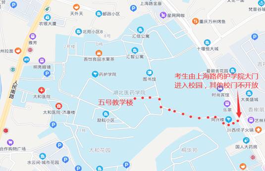 湖北医药学院五号教学楼,示意图如下。特别提醒:考试当日考生由上海路药护学院校门进入校园,请勿前往其他校门。因疫情防控需要,考点禁止外来车辆入内,请尽量选择车辆送接或公共交通出行。非考生本人不允许进入考点。