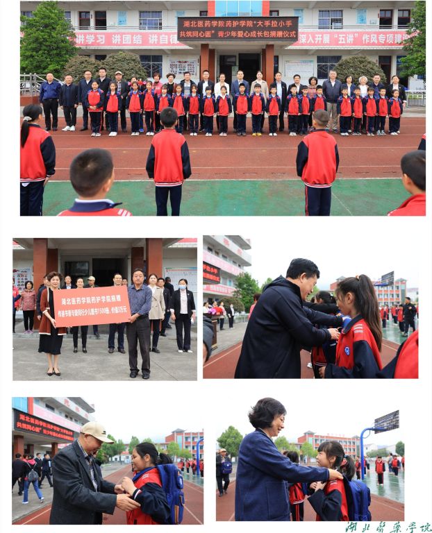 王云甫代表学校关工委向县河中心学校捐赠50套爱心成长包,袁文代表学校向县河中心学校捐赠图书,校关工委委员为20名学生代表佩戴书包。王云甫为孩子们送上“六一”祝福,希望同学们树立远大理想,积极进取,继承和发扬中华民族的传统美德;努力学习各种新知识,练好过硬本领,成为国家的栋梁之才。