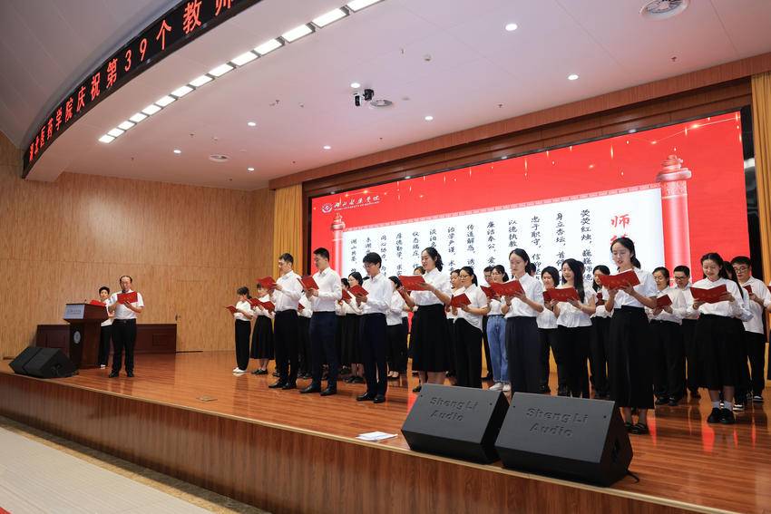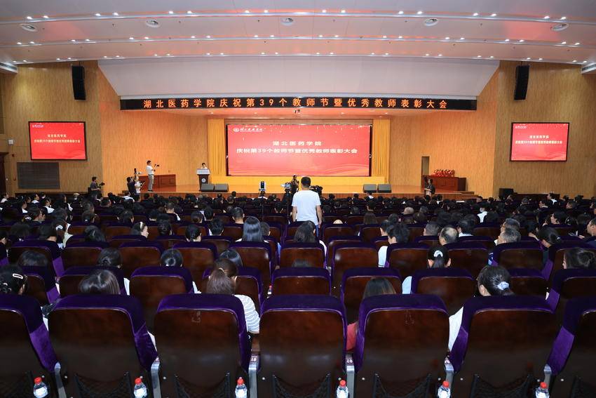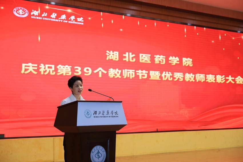 北日报客户端讯(通讯员 鲍晓宇)9月7日下午,湖北医药学院庆祝第39个教师节暨优秀教师表彰大会在科教楼学术报告厅举行。全体校领导、各附属医院领导、2023年“荣休”人员、“从教满三十年”教师、2023年“记功”奖励人员、新进教职工、各类获奖教师,以及副处级以上干部、副高以上职称人员、全体无课专任教师、学生代表齐聚一堂,共贺节日、表彰先进、展望未来。大会由党委常委、副校长严世荣主持。