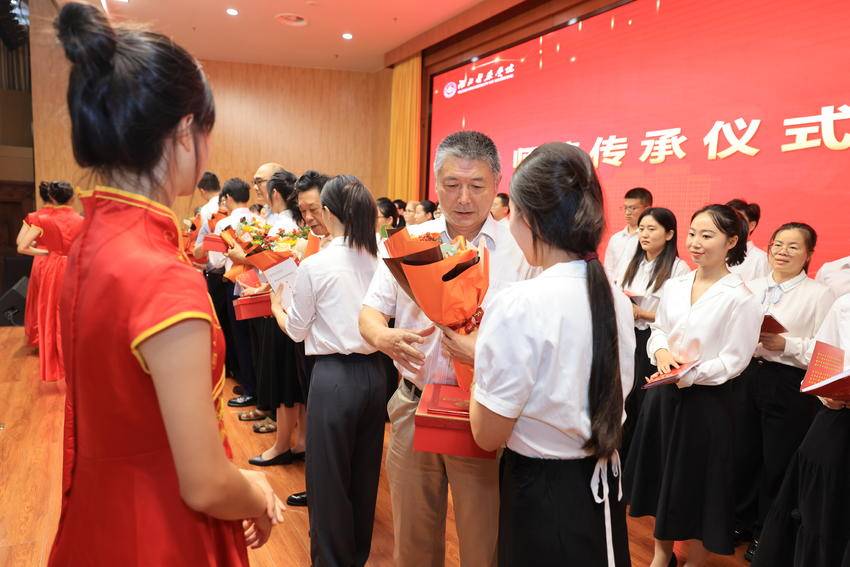 在师德传承仪式上,为学校发展贡献一生的老“湖医药人”即将光荣退休,一批朝气蓬勃的新“湖医药人”即将接过历史的“接力棒”,赓续湖医药精神,续写湖医药荣光。这是一次特别的交班仪式,这是湖医药教师对立德树人初心使命的坚守与传承。随后,2023年“荣休”教职工代表为2023年新进教职工赠送《师德学习教育手册》,新进教职工代表为“荣休”教师代表赠送荣休证书及纪念品。