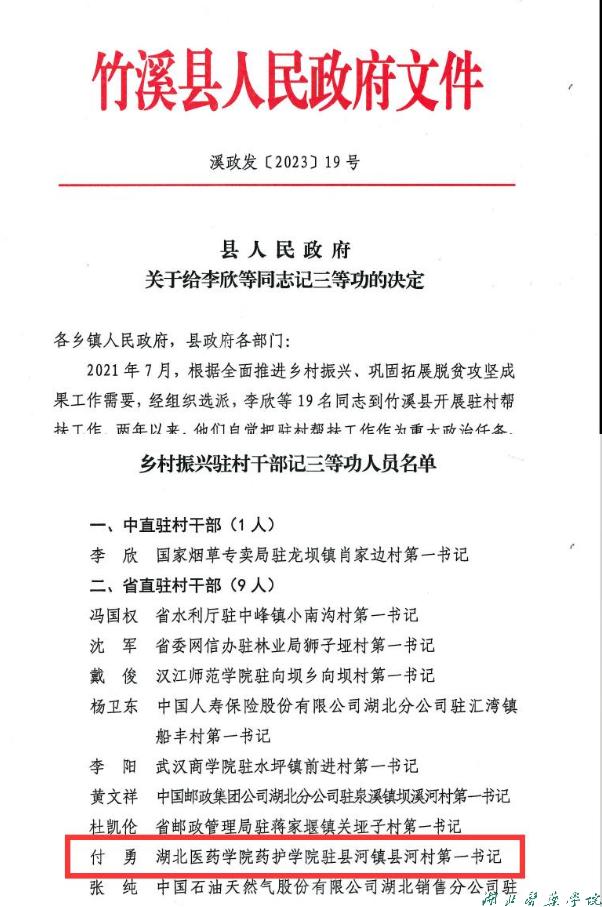 近日,十堰市竹溪县政府下发《关于给李欣等同志记三等功的决定》,对包括湖北医药学院药护学院驻县河镇县河村第一书记付勇在内的19名驻村干部记三等功一次。