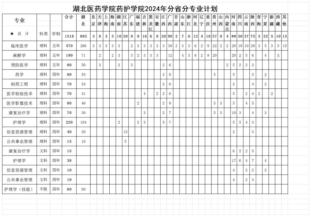 (本网讯 通讯员 郝若男)近日,湖北省教育厅给我院下达了2024年本科招生计划。今年,我院将面向全国31个省(市、自治区)招收本科生1518人,其中,省内885人、省外618人。计划类型包括普通本科计划,中西部协作计划,技能高考本科计划等。技能高考本科计划60人,面向省内招收参加技能高考的中职考生,招生专业为护理学。